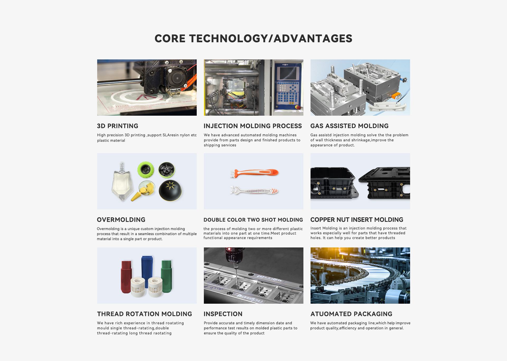 Serviços adicionaisDecoração em moldura, moldes de injeção, moldes de plástico, sobremolagem, moldes de dois tiros, moldes de fundição, moldes de pilha, moldes intercambiáveis, moldes de núcleo dobrável, conjuntos de moldes, moldes de compressão, sistemas de corredor frio, moldes do sistema de corredor quente, etc.